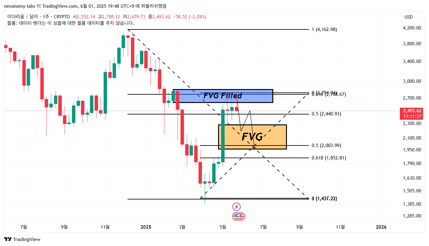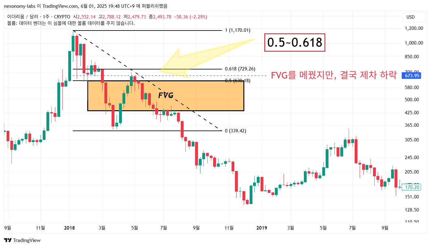 지금도 이더리움을 보면 유독 비슷합니다. 4200불을 갔고 1385불 까지 하락을 했습니다. 중간에 FVG를 형성 했고 2700불 까지 되돌림을 줬습니다. 하지만, 저항을 못 벗어나고 3200불 기준에서 1400불까지의 피보나치를 젰을 때 618자리에 위치해 있습니다.