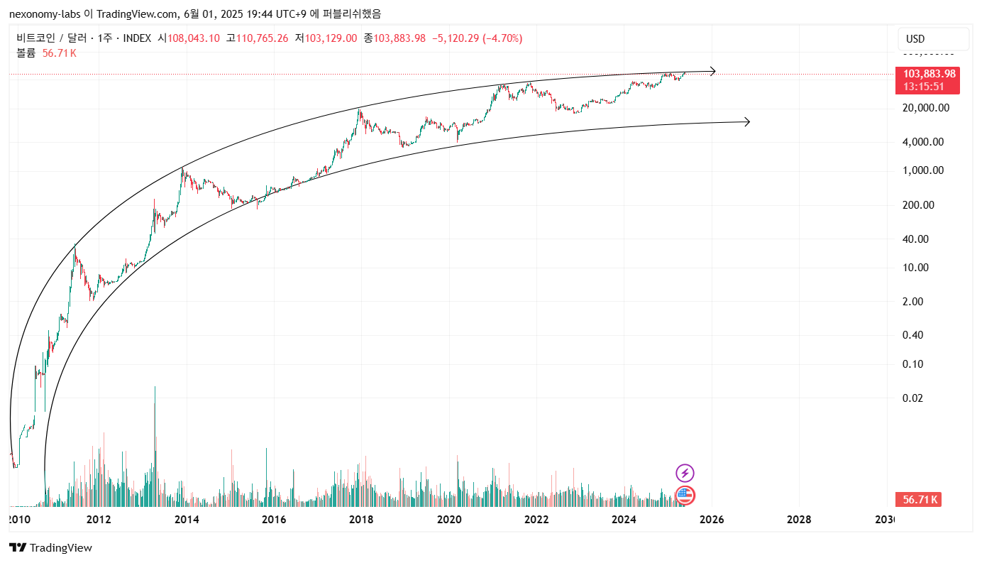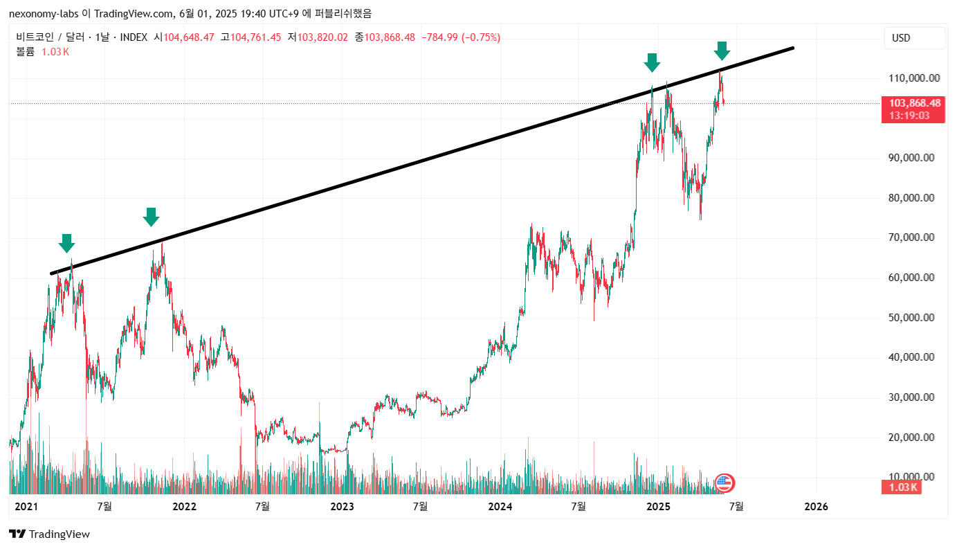 위 사진을 보면 더 확실 할 수 있을 것입니다. 위 곡선은 비트코인 탄생 처음날 부터 젠 고점입니다. 보시게 되면 매번 맞고 하락장이 지속 됬습니다. 따라서 지금 고점 트라이를 또 할 수 있겠습니다만, 지금은 더 신고가 가기 어렵습니다.